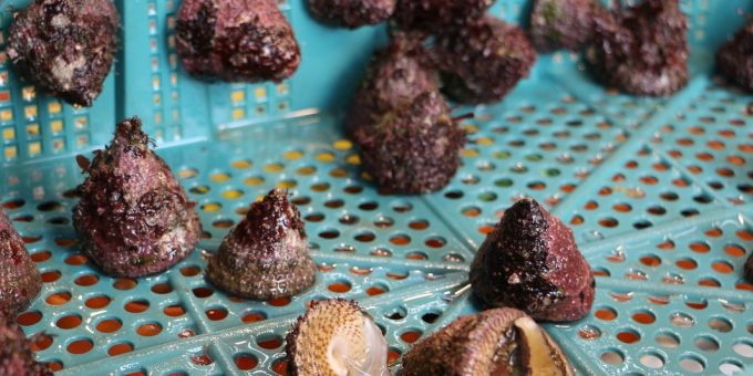 龜吼漁夫市集鐘螺,口感鮮脆,是北海岸常見的漁村美食,燒烤、涼拌、熱炒都很合適 。(圖/漁業處提供)