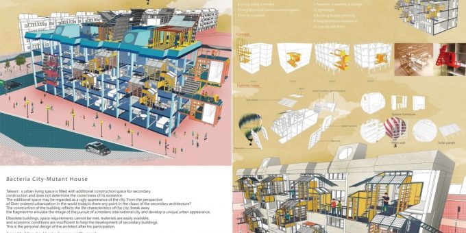 張郁靂系主任表示,陳辰瑋的《城市菌生-生活突變的建築》作品,是探討台灣特有的二次增建文化,顯現人們對於生活需求的不滿足,因此,提出以黏菌生長、植生的概念,構築都市中增建的生活空間,將共享及交流空間延伸至立面,以達成共生互利的狀態,在已飽和的城市發展中衍生新的可能與秩序。
