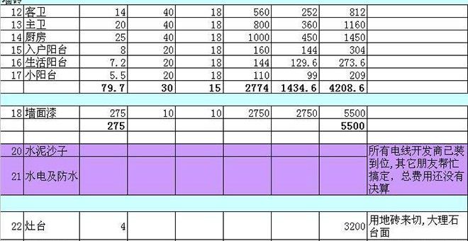 六、油漆部分最好全部換算成桶或者升,因為油漆是按桶或者升來購買的。電線要換算成卷或者米。輔料當中的水泥黃沙要換算成包。