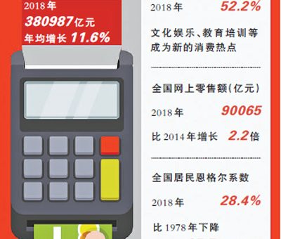 從商品消費看,2018年全國居民恩格爾係數為28.4%,比1978年下降35.5個百分點。董超認為,隨着居民收入水平穩步提高以及消費觀念轉變,居民消費從注重量的滿足轉向追求質的提升,品質消費、智能產品消費、綠色消費等成為熱點。