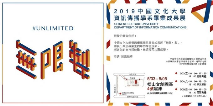 【民生頭條】中國文化大學資訊傳播學系2019年畢業成果展-「無限·製」,於5月3日至5月5日在松山文創園區4號倉庫熱鬧展開。資傳系主任李亦君開心地說:「歡迎大家來到松山文創園區,讓我們與您一同體驗網路時代的資訊傳播新風貌。」