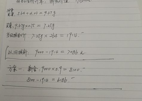 據了解,銷售人員的算賬方式是這樣的:舊款戒指的價值=舊款克重的七五折(5.64+4.03=9.67克×0.75=7.25克)×當日舊金的回收價(264元/克)=7.25×264=1914元;新款戒指是定價商品,男款標價5170元,女款標價3830元,合計9000元;置換貼補差價為9000-1914=7086元。