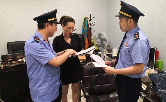 桂林市市場監管局旅遊分局執法人員檢查涉事購物店遊客購物台賬。 陽顯超/攝