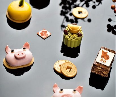 主廚指出,今年農曆春節應景的吉祥物是胖嘟嘟的生肖豬,於是將味甘而醇的烏龍茶奶霜結合清爽酸甜覆盆子果醬勾勒出維妙維肖的小豬,有「諸事圓滿」的祝福之意。同時,在主廚的巧手下,過年時分家家戶戶必定會準備的橘子,化身為酸甜可口,小巧可愛的柑橘慕斯球,不僅口感清新,更是大吉大利的好兆頭。雙人下午茶每套NT$1,680+10%,數量有限,菜色依實際販售狀況調整。