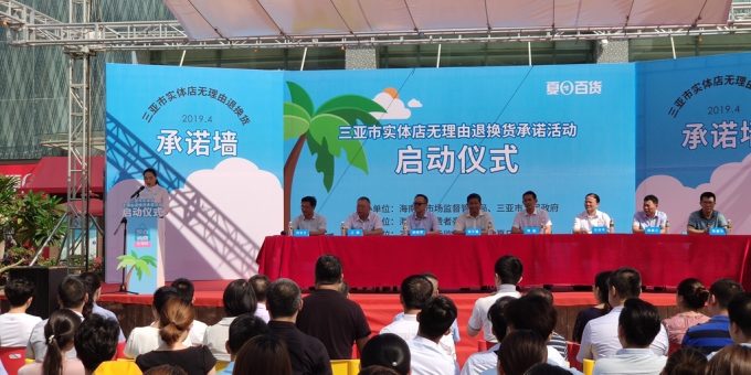 4月26日上午,海南省市場監督管理局和三亞市人民政府共同在三亞市夏日百貨啟動了線下實體店無理由退貨承諾活動,三亞市一批大型商場、超市、景區景點和旅遊購物點率先做出無理由退貨承諾,自願開展七日無理由退貨承諾,率先在全省範圍內拉開了線下實體店無理由退貨承諾的序幕,今後三亞消費者將享受更便捷的線下實體店無理由退換貨服務。
