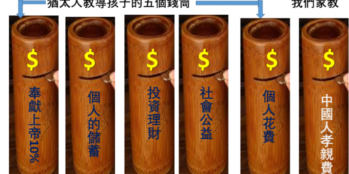 猶太人世界人口中所佔的比例僅為0.3%,但卻賺取了世界上30%的財富﹐獲得了世界上17%的諾貝爾獎。 全美一百多名諾貝爾獎得主﹐猶太人佔一半﹔ 《福布斯》美國富豪榜前40名中﹐猶太人有18名;為什麼?猶太人除了依照教義來教導外,從小就教導孩子認識『五個存錢筒』概念