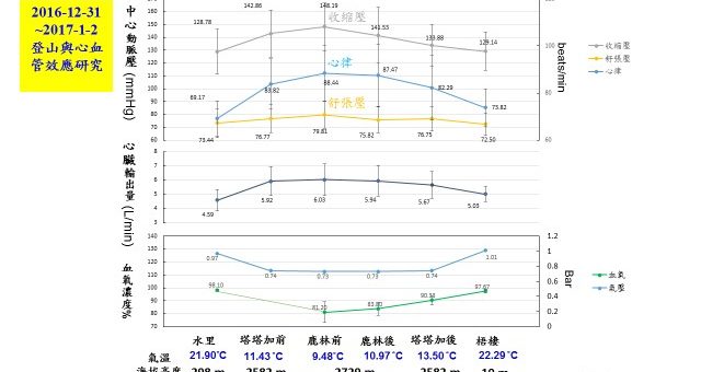 我們發現在塔塔加遊客服務中心血壓上升14毫米汞柱,而到鹿林山莊時,血壓(收縮壓及舒張壓)上升近20 毫米汞柱,血氧濃度從98%下降到90%(塔塔加),而到達鹿林山莊時平均血氧濃度下降至81%,而心跳顯著增加每分鐘20下(從68/min到88/min,約增加25%),心搏輸出量(Cardiac Output)也增加將近25%。另外,我們也發現在往高海拔爬升的過程當中,我們由塔塔加及鹿林山莊的前後測量比較發現,即使是一個小時或兩個小時的休息適應,對心臟血管的適應,都是非常重要的。(Su TC. Pulse of Asia, POA 2017, Invited Speech)