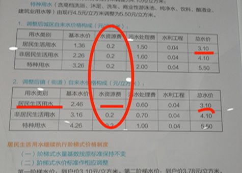 讓人不解的是,這份《水價公示》中,儘管在水價構成明細及構成項目上城鄉各異,且後者(鄉鎮)飲用水水價構成中显示無水資源費,但到戶價格卻一致,即城鄉水價都是3.10元/立方米。