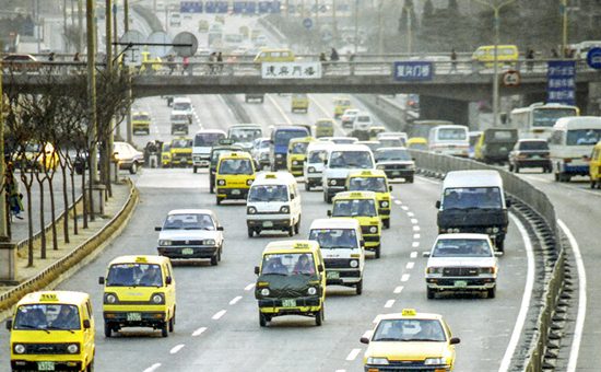 1993年12月,北京西二環復興門橋區行駛的黃色麵包出租車,市民稱之為“黃面的”。20世紀八九十年代,北京市機動車保有量不足百萬輛,私家車更是鳳毛麟角。北京市投放大量黃色微型麵包出租車投入運營,由於價格便宜(一元錢一公里),深受市民歡迎。