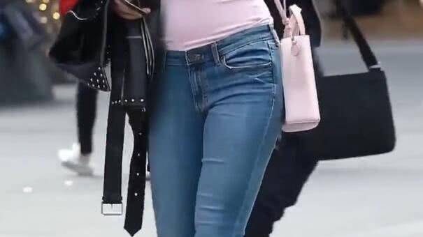 小姐姐穿了一款九分牛仔褲,與一雙平底鞋穿在一起。高挑的身材,即使是平底鞋,也能塑造出一種大長腿的效果。身材略有點微胖的她,穿上牛仔褲,也有一種緊繃感,很好的展示出一種個性美。