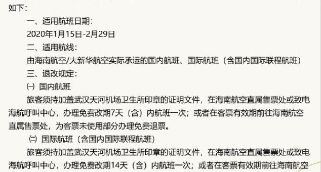 海南航空表示,退改規定適用航班日期為2020年1月15日-2月29日。國內航班方面,旅客須持加蓋武漢天河機場衛生所印章的證明文件,在海南航空直屬售票處或致電海航呼叫中心,辦理免費改期7天(含)內航班一次;或者在客票有效期前往海南航空直屬售票處,為客票末使用部分辦理免費退票。