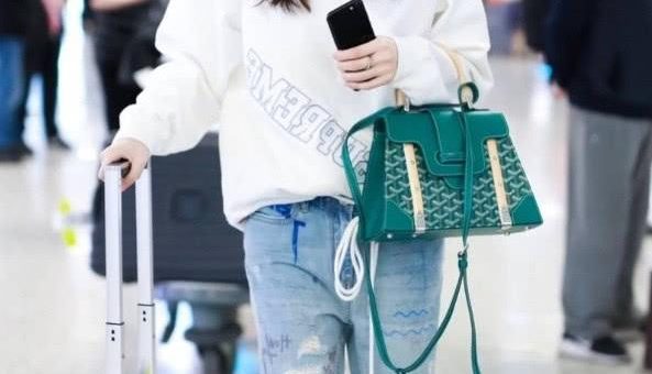 喬欣穿着破洞牛仔褲,一邊露大腿,一邊只露膝蓋,也是很時尚了。她頭戴一頂綠色的棒球帽,穿着白色的連帽衛衣,盡顯青春時尚感。喬欣手提一個綠色的皮包,與帽子相呼應,顯出時尚小心機!
