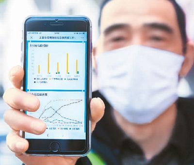 2月20日,在浙江省杭州市富陽區上官鄉芳村檢查點,工作人員展示手機上的“疫情防控雲圖”的實時數據。