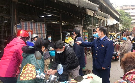 2月4日,鮑林(右,穿制服者)在百色市城西農貿市場勸導疏散搶購活禽的消費者。