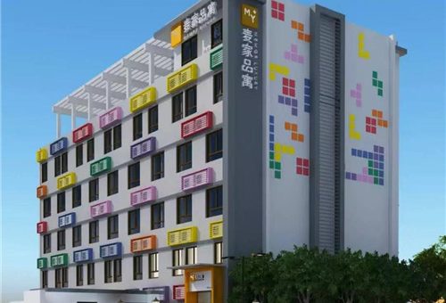 麥家“品寓”武林店創意來源於經典移動小遊戲“俄羅斯方塊”,從主流色系中挑選出了“黃、綠、粉、藍、橙”等,多彩的色調,藉助不同純色小方塊進行花式拼接。