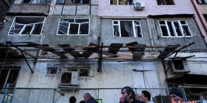 納卡地區主要城市斯捷潘納克特在交火中受到波及,居民住宅受損。圖為受損的居民住宅。