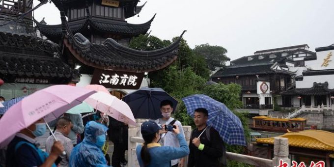 10月4日,市民和遊客冒雨在南京夫子廟景區內品美食、游秦淮河、參觀夫子廟,感受明清科舉文化。