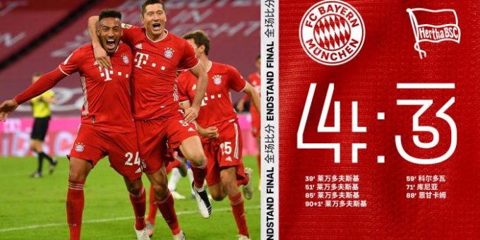 在比賽中,萊萬在第40分鐘和第51分鐘的兩粒進球幫助拜仁取得2:0領先,但柏林赫塔頑強將比分扳平。第85分鐘,萊萬禁區內推射破門,但僅3分鐘后柏林赫塔就再次將比分扳平。比賽最後時刻,萊萬點球絕殺,拜仁4:3戰勝柏林赫塔。