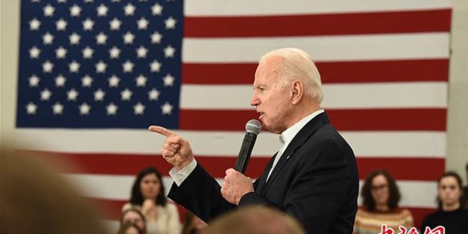 當地時間2月29日,美國民主黨總統競選人拜登贏得2020年大選第四站——南卡羅來納州初選。資料圖為當地時間2月2日,拜登在艾奧瓦州舉行造勢。中新社記者 陳孟統 攝
