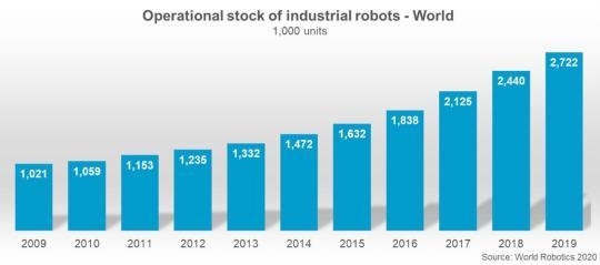 國際機器人聯合會(International Federation of Robotics,下稱IFR)近日在其年度報告中稱,得益於智能製造和自動化,世界各地工廠內正在運行的工業機器人數量超過270萬台,創下新紀錄。2014年至2019年五年時間里,全球機器人安裝量增加近85%。但由於兩大傳統應用市場——汽車和電氣电子行業不景氣,2019年工業機器人年度安裝量下滑近12%。