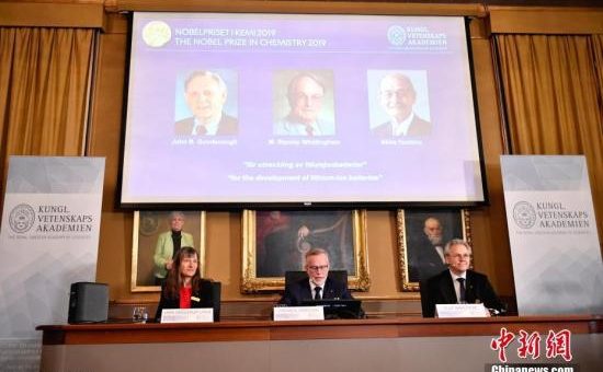 資料圖:當地時間2019年10月9日,瑞典皇家科學院將2019年諾貝爾化學獎授予約翰·古迪納夫(John B. Goodenough)、M·斯坦利·威廷漢(M. Stanley Whittingham)和吉野彰(Akira Yoshino),以表彰其在鋰電池發展上所做的貢獻。