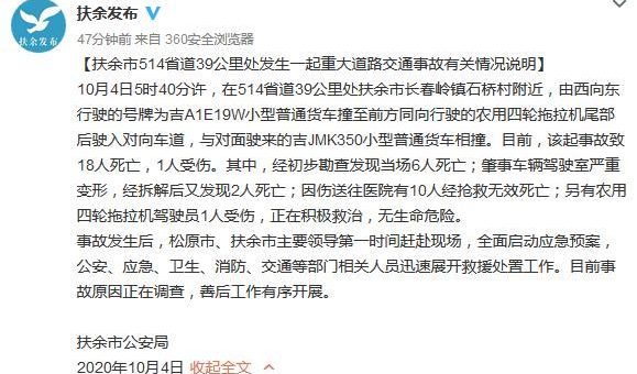 中新網10月4日電 據吉林省扶余市人民政府新聞中心官方微博消息,扶余市公安局4日晚就扶余市514省道39公里處發生的重大道路交通事故有關情況作出說明。10月4日5時40分許,在514省道39公里處扶余市長春嶺鎮石橋村附近,由西向東行駛的號牌為吉A1E19W小型普通貨車撞至前方同向行駛的農用四輪拖拉機尾部后駛入對向車道,與對面駛來的吉JMK350小型普通貨車相撞。目前,該起事故致18人死亡,1人受傷。