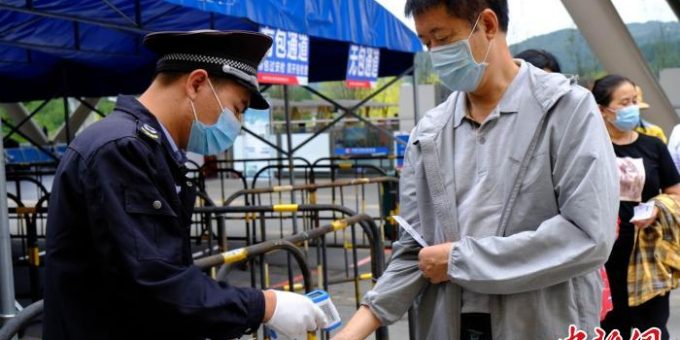 圖為遊客進入“中國天眼”天文科普基地時測量體溫。 田舉 攝