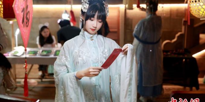 身着漢服的女子逛福建省福州市鼓樓區善化坊藏天園文化夜市。藏天園文化夜市供圖
