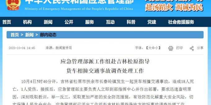 中新網10月4日電 據應急管理部網站消息,10月4日5時40分許,吉林省松原市扶余市長春嶺鎮發生一起貨車相撞交通事故,造成18人死亡,1人受傷。