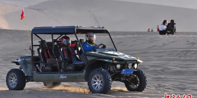 “十一”黃金周假期,甘肅敦煌鳴沙山月牙泉景區迎來上萬名遊客同游鳴沙山,上千匹駱駝載客暢遊其中,形成長約2公里的環形長隊,遠遠望去,頗為壯觀。不遠處,沙漠摩托車、越野車載客在沙海衝浪,體驗大漠驚險和刺激;直升機、滑翔機空中飛翔帶遊客盡情鳥瞰大漠壯美秋色;數千名遊客爬鳴沙山登高遠望,連綿沙海、美麗秋色、神奇月牙泉盡收眼底。