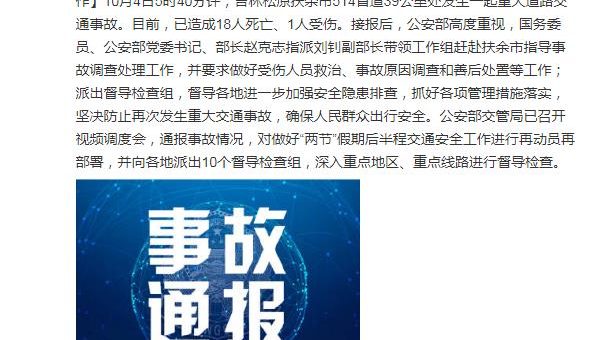 中新網10月4日電 據公安部交通管理局官方微博消息,10月4日5時40分許,吉林松原扶余市514省道39公里處發生一起重大道路交通事故。目前,已造成18人死亡、1人受傷。