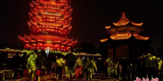 資料圖,圖為2020年“十一”黃金周,遊客夜遊黃鶴樓 張暢 攝