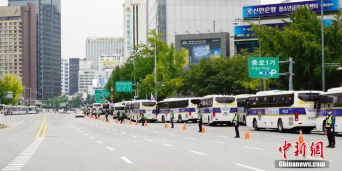 記者在首爾市中心看到,大批警力將光化門廣場附近圍得“水泄不通”;從市廳到光化門,數公里路段有數百輛警車停靠,行人道上設有諸多柵欄,禁止隨意出入,市廳站等多個地鐵站關閉。警方全部戴有面罩和口罩。