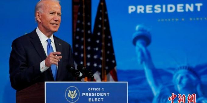 當地時間12月14日,美國當選總統拜登在特拉華州威爾明頓皇后劇院的過渡總部發表電視講話。