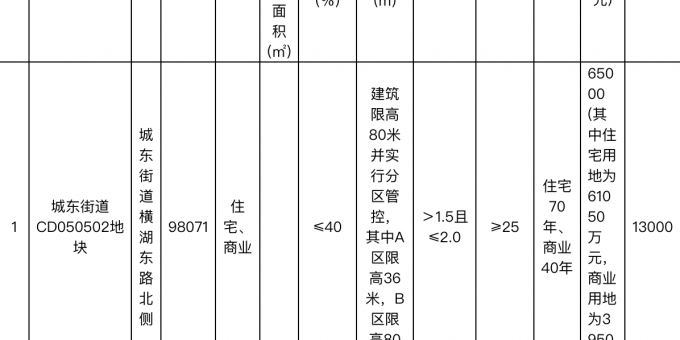地塊編號溫土公告字[2020]整第85號,地塊名稱為城東街道CD050502地塊,出讓面積9.81萬平,土地用途為商住用地,容積率2,建築面積19.61萬平,起始價6.5億元。