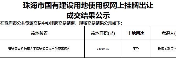 中國網地產訊 1月12日,珠海1宗商務地塊成功出讓,最終珠海太聯有限公司(格力地產)以8.8億元競得。