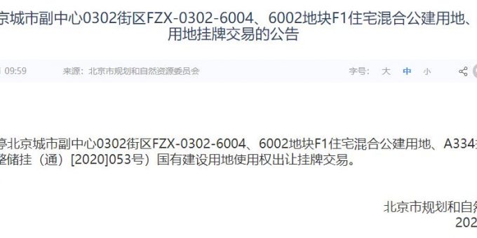 地塊編號京土整儲掛(通)[2020]053號,地塊名稱為北京城市副中心0302街區FZX-0302-6004、6002地塊,建設用地面積4.45萬平,規劃建築面積≤95931.32平方米,土地用途為F1住宅混合公建用地、A334托幼用地,地塊位於通州區梨園鎮,起始價17.9億元。