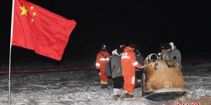 中新網北京12月17日電 (李京澤)北京時間12月17日1時59分,嫦娥五號返回器在內蒙古四子王旗預定區域成功着陸,標志著中國首次月球採樣返回任務圓滿完成。
