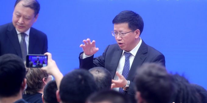 圖為發布會結束后,吳艷華接受媒體追問。 中新社記者 張宇 攝