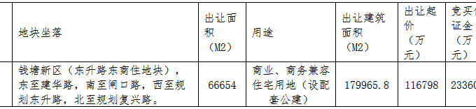 資料显示,該地塊編號為杭錢塘儲出[2020]11號,位於錢塘新區,東至建華路,南至閘口路,西至規劃東升路,北至規劃復興路。出讓面積66654㎡,起始價11.68億元,競買保證金2.34億元,上限價格為15.18億元。