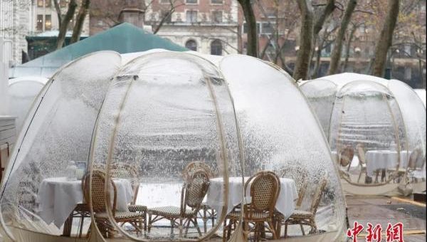 資料圖:當地時間12月9日,美國紐約迎來今冬首場降雪,布萊恩公園的戶外用餐“泡泡屋”覆蓋白雪。中新社記者 廖攀 攝