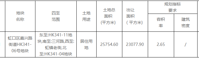 虹口區嘉興路街道HK341-06號地塊序號為202100201號。地塊東至HK341-11地塊,南至三河路,西至虹鎮老街,北至HK341-04地塊,出讓面積23077.9㎡,建築面積61156.44㎡,起價47.2億元,樓面起價77179元/㎡。地上建築限高100米,住宅套數下限570套。