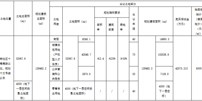 資料显示,該地塊編號為376-346-370213-010-004-GB00058,公告號為青自然資規告字[2020]26號,位於李滄區十梅庵路以北、規劃十三號線以東。規劃建築面積129462.2㎡,起始價8.415億元元,競買保證金4.21億元,建築密度≤25%,率≥30%。