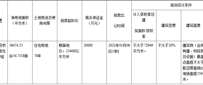 中國網地產訊 1月6日,成都市以拍賣方式成功出讓一宗住宅用地。最終,成都綠曙置業有限公司()以11.23億元競得,樓麵價15400元/㎡,溢價率14.93%,移交統籌住房面積比例8%。