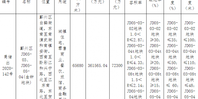 地塊編號甬儲出2020-142號,地塊名稱為鄞州區JD05-03、JD05-05-04(金鐘地塊),出讓面積6.57萬平,土地用途為商住用地,容積率3.13,建築面積20.55萬平,起始價36.16億元。
