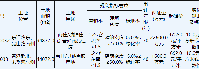 地塊編號CR20032,地塊名稱為海門區東江路東、品山路南側地塊,出讓面積9.49萬平,土地用途為商住用地,容積率1.5,建築面積14.23萬平,起始價4.52億元。
