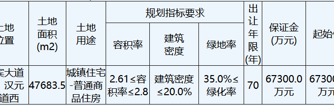 資料显示,該地塊編號為2020-51號,位於迎賓大道南、漢元大道西。出讓面積47683.5㎡,起始價6.73億元,建築密度≤20%,率≥35%,建築高度≤80米。