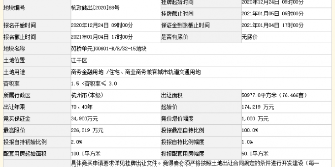 資料显示,該地塊編號為杭政儲出[2020]68號,位於江干區,東至規劃綠化,南至規劃黎明路,西至規劃明石路,北至規劃筧石路。出讓面積50977㎡,起始價17.42億元,競買保證金3.49億元,上限價格為22.62億元。
