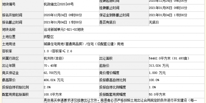 資料显示,該地塊編號為杭政儲出[2020]69號,位於拱墅區,東至規劃道路,南至候聖街,西至規劃麗水路,北至謝村路。出讓面積54462㎡,起始價31.3億元,競買保證金6.27億元。