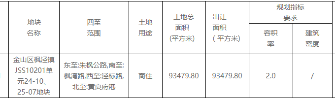 資料显示,該地塊編號為202023401,位於金山區楓涇鎮,東至朱楓公路,南至楓灣路,西至涇標路,北至黃良府港。出讓面積9.35萬平,起始價9.36億元,競買保證金1.87億元。